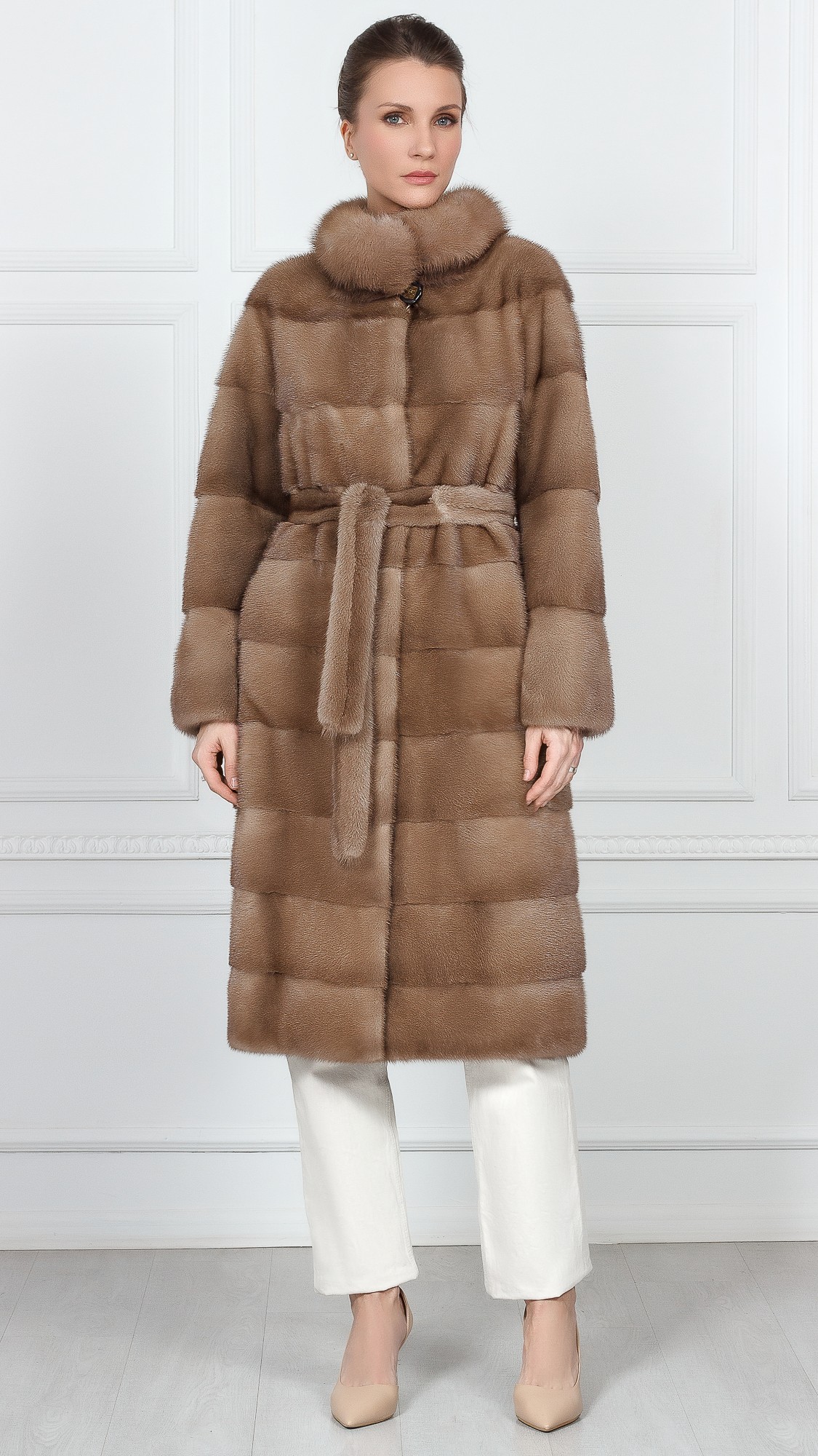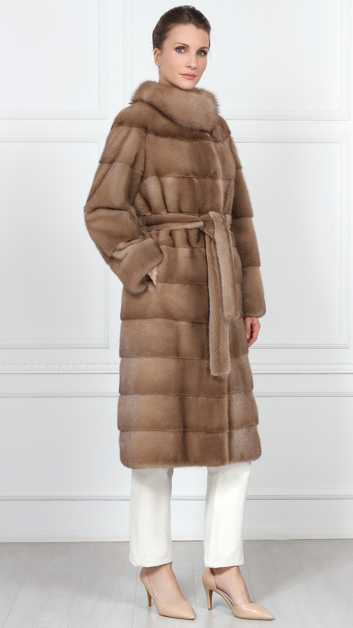Шуба из меха норки, отделка куница
